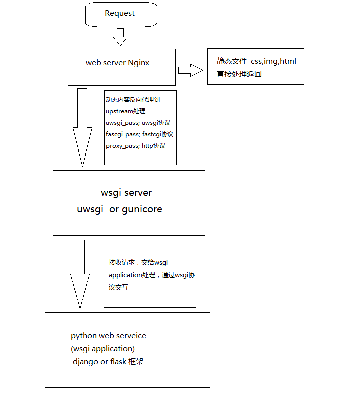 nginx 接收到浏览器发送过来的http请求,将包进行解析,分析url,如果是静态文件请求就直接访问用户给nginx配置的静态文件目录,直接返回用户请求的静态文件, 如果不是静态文件,而是一个动态的请求,那么nginx就将请求转发给uwsgi,uwsgi 接收到请求之后将包进行处理,处理成wsgi可以接受的格式,并发给wsgi,wsgi 根据请求调用应用程序的某个文件,某个文件的某个函数,最后处理完将返回值再次交给wsgi,wsgi将返回值进行打包,打包成uwsgi能够接收的格式,uwsgi接收wsgi 发送的请求,并转发给nginx,nginx最终将返回值返回给浏览器。